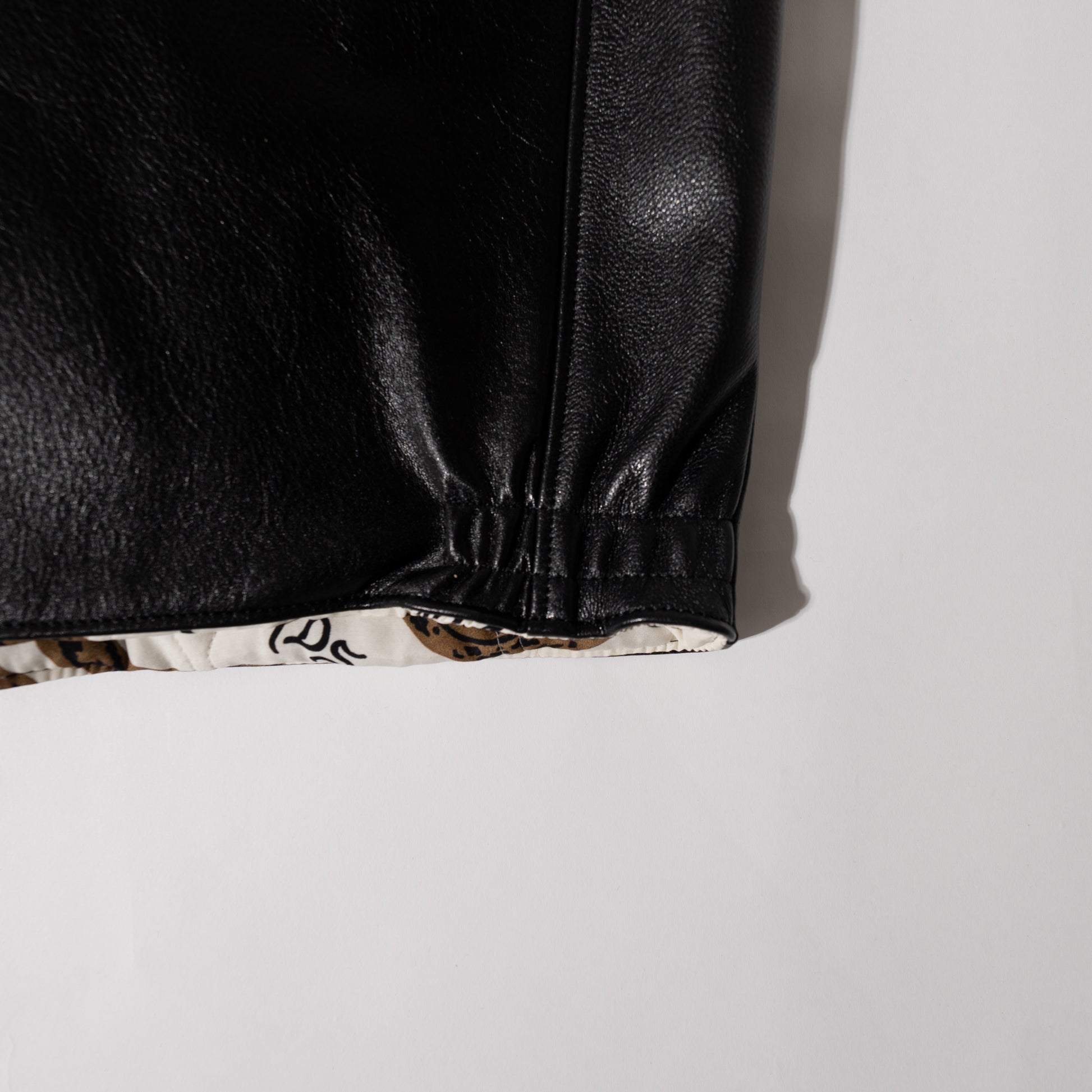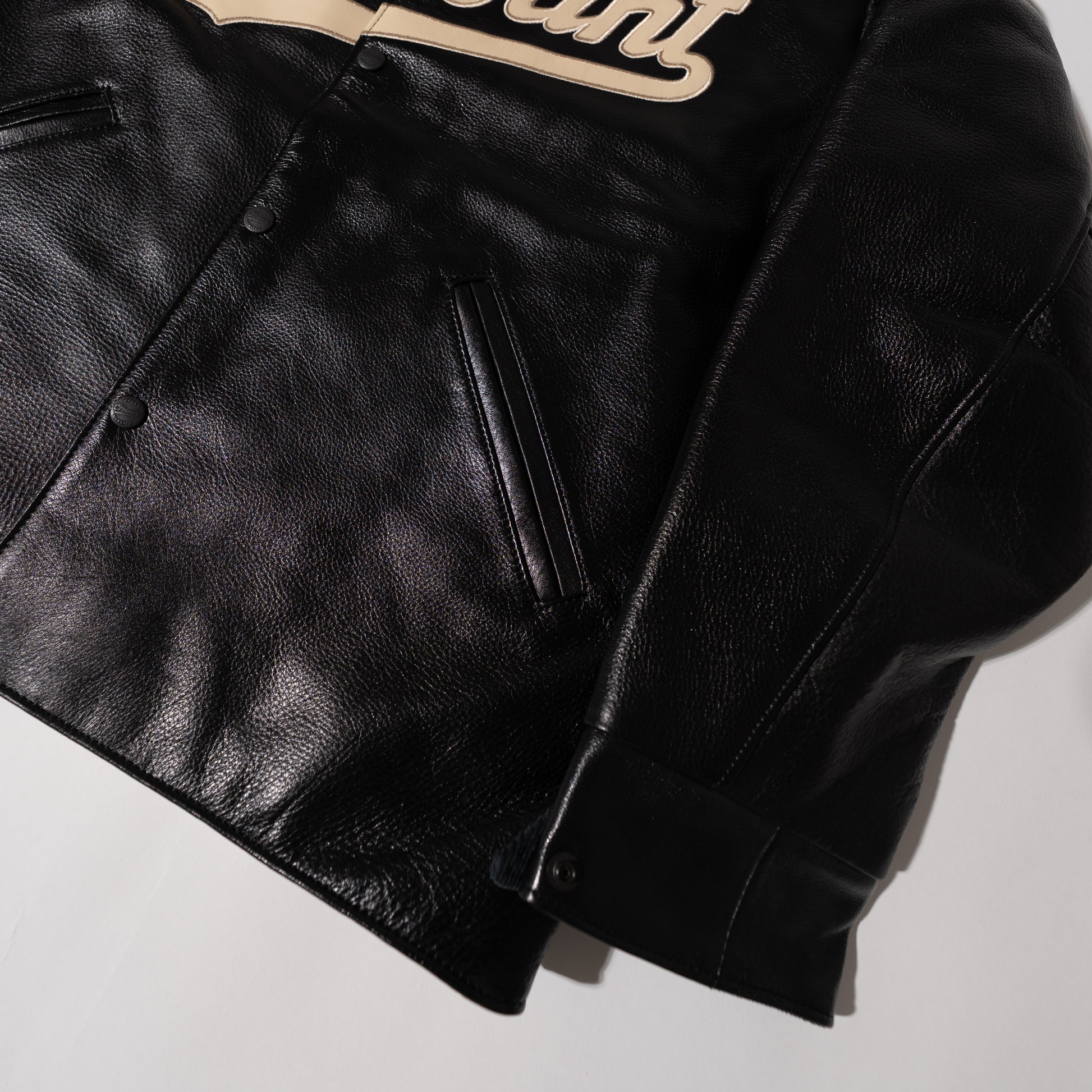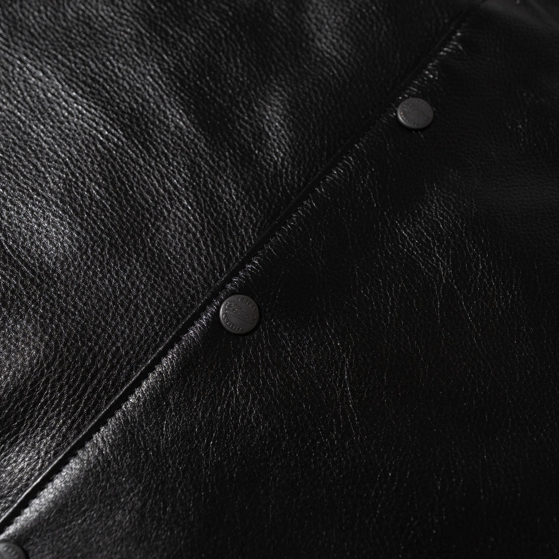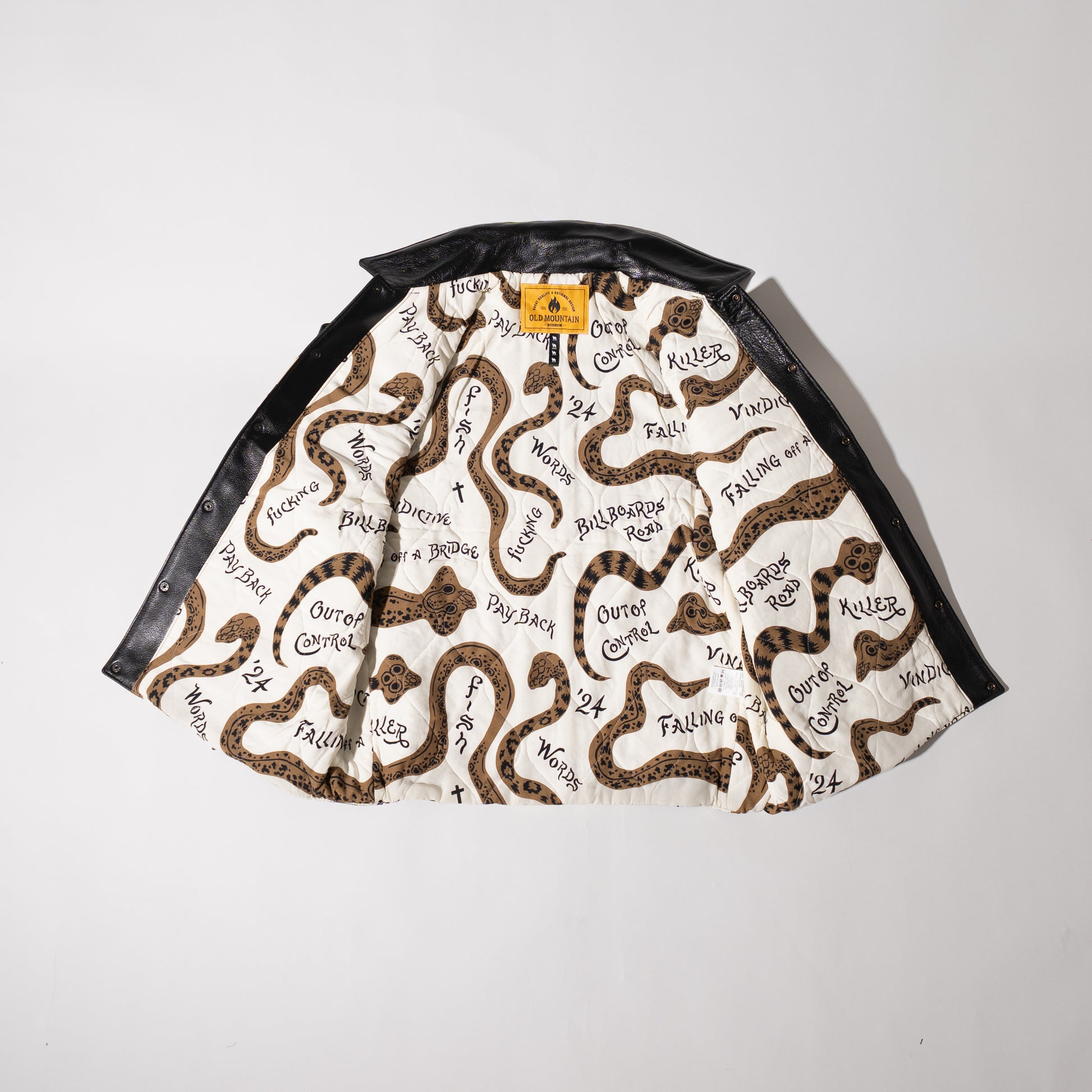 ヴィンテージでも定番で高い人気を誇るアワードジャケットをイメージソースに 職人が1枚ずつ手仕事で仕上げたムラ加工が特徴の本牛革を使用し 現代的なシルエットにアップデートしつつフロントにはブランドロゴを配置した。 裏地には"ALOHA SHIRT" で制作したオリジナルレーヨンを採用 グラフィックには デザイナーL. デザインのSNAKが描かれている。 BODシルエットのやや大きめのサイズ感をイメージし 往年のヴィンテージスタイルを彷彿とさせる1着に完成。 フロントグラフィック" OL’ MOUNT" は OLD MOUNTAIN を古い呼び方で崩したニックネーム。 アメリカの昔ながらの言葉で “OL’” は “OLD” の親しみある言い回し。 ブランドのもう一つの顔として、古き良き時代の温もりとスピリットを表現。 - 素材 - 牛革特有のタフさをしっかりと感じられる約1.3mm厚の北米ステアハイドを採用。 クローム鞣しによって厚みがありながらもしなやかで、ふっくらとした感触を持たせている。 自然な風合いを残しつつ、程よい艶を添えるラッカー仕上げが、上質な存在感を引き立てます。