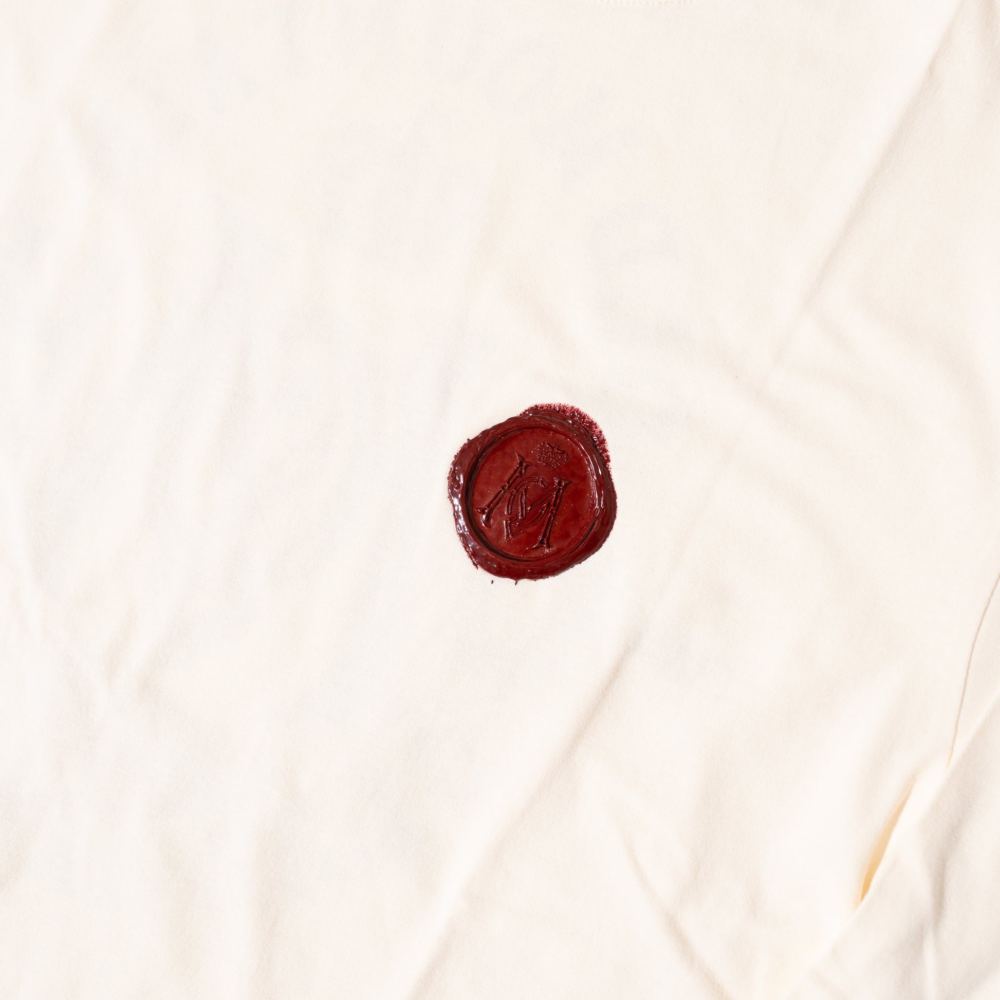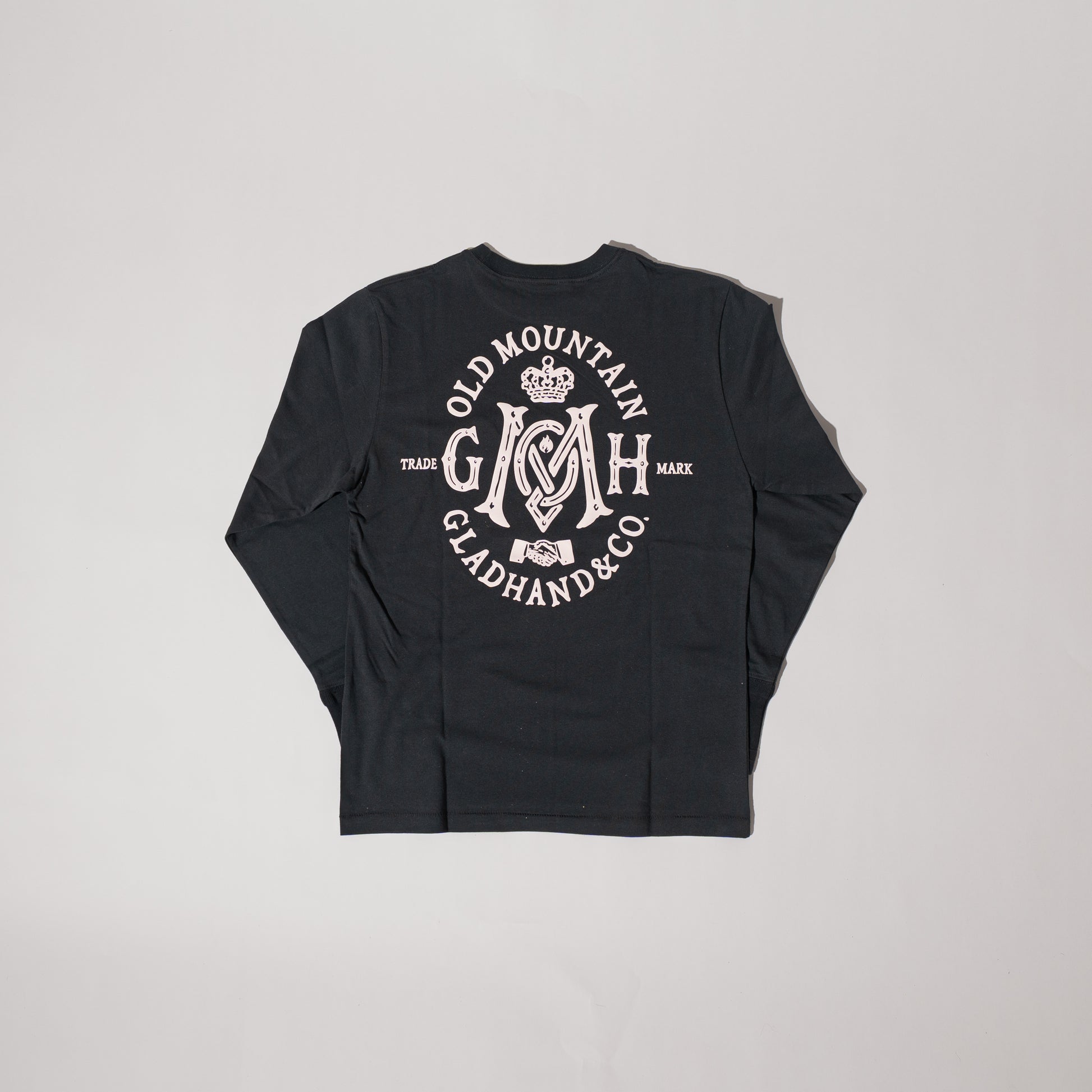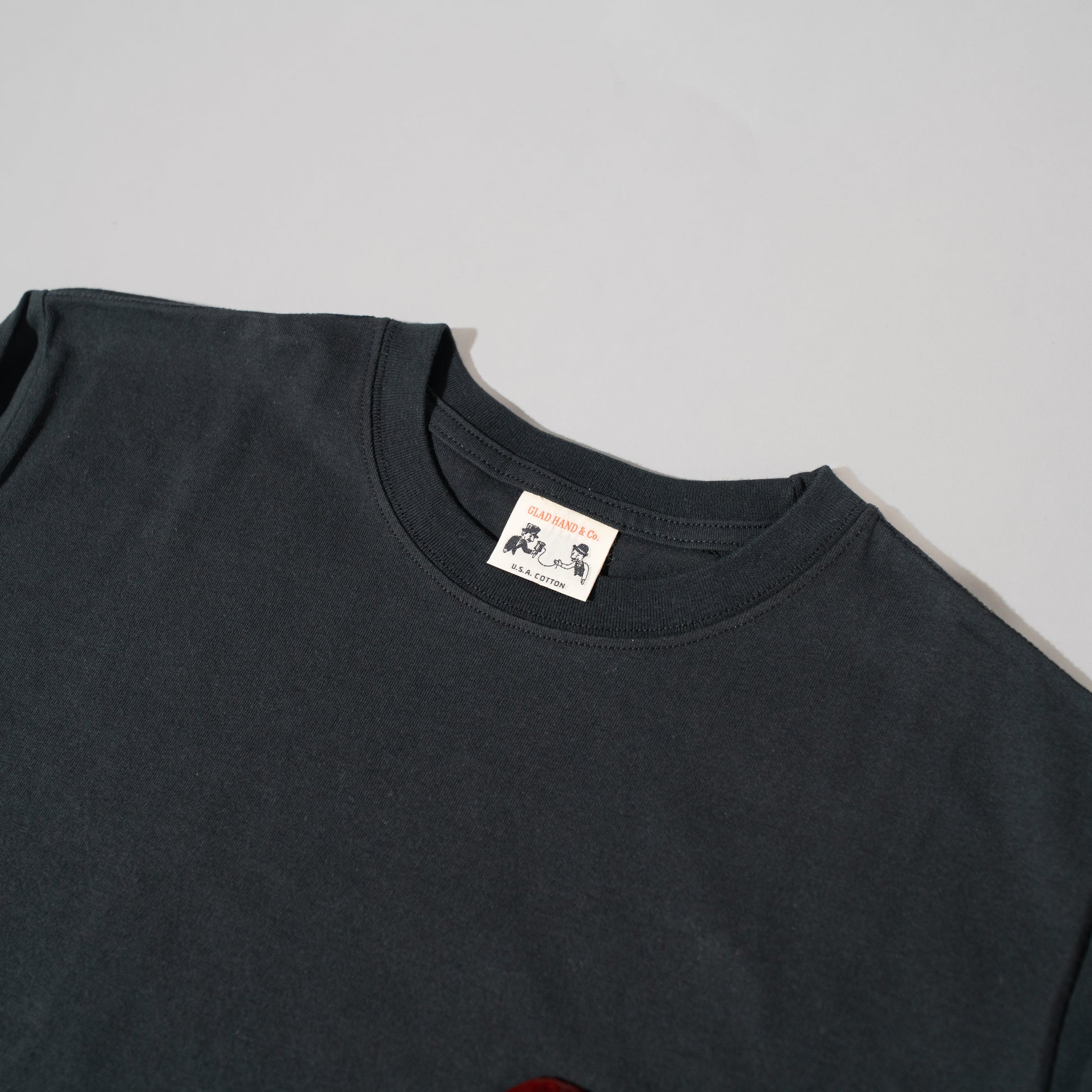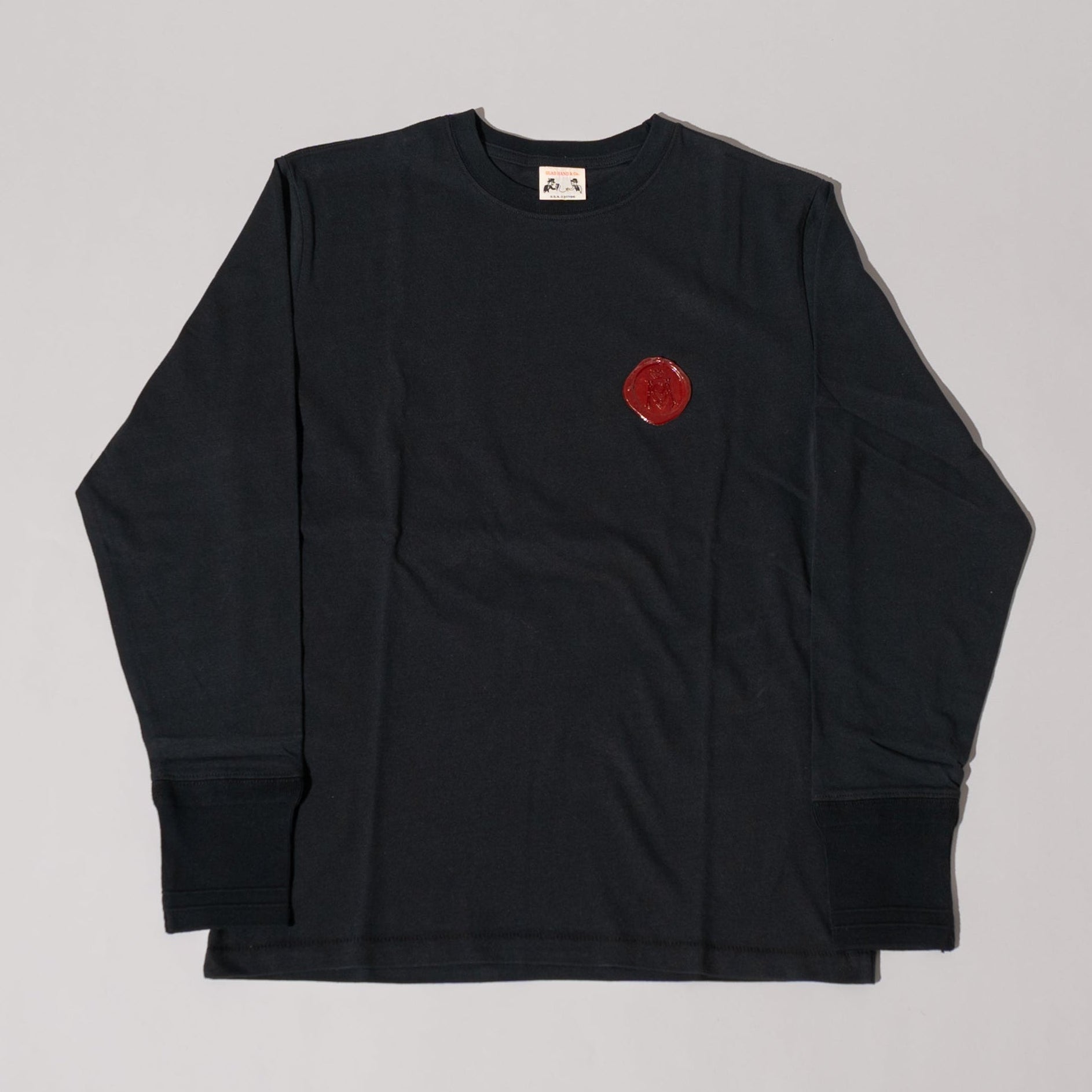 (product by GLADHAND&CO.) グラフィック 古い手紙や歴史的な文書の封緘に使われたシーリングスタンプをイメージし、モチーフを図案化。 特殊な技法により、蝋(ろう)押し特有のゆらぎや凹凸感を再現し、本物の深みと存在感を宿したプリントをフロントにデザイン。 バックプリントには、今回のコラボレーションを象徴する ブランドの頭文字を組み合わせたモノグラムをレイアウト。 両ブランドの世界観が響き合い、歴史を感じさせる重厚で印象的な一着に仕上がっています。 BODY : U.S.A. COTTON GH-08 プリント : ヴィンテージラバープリント